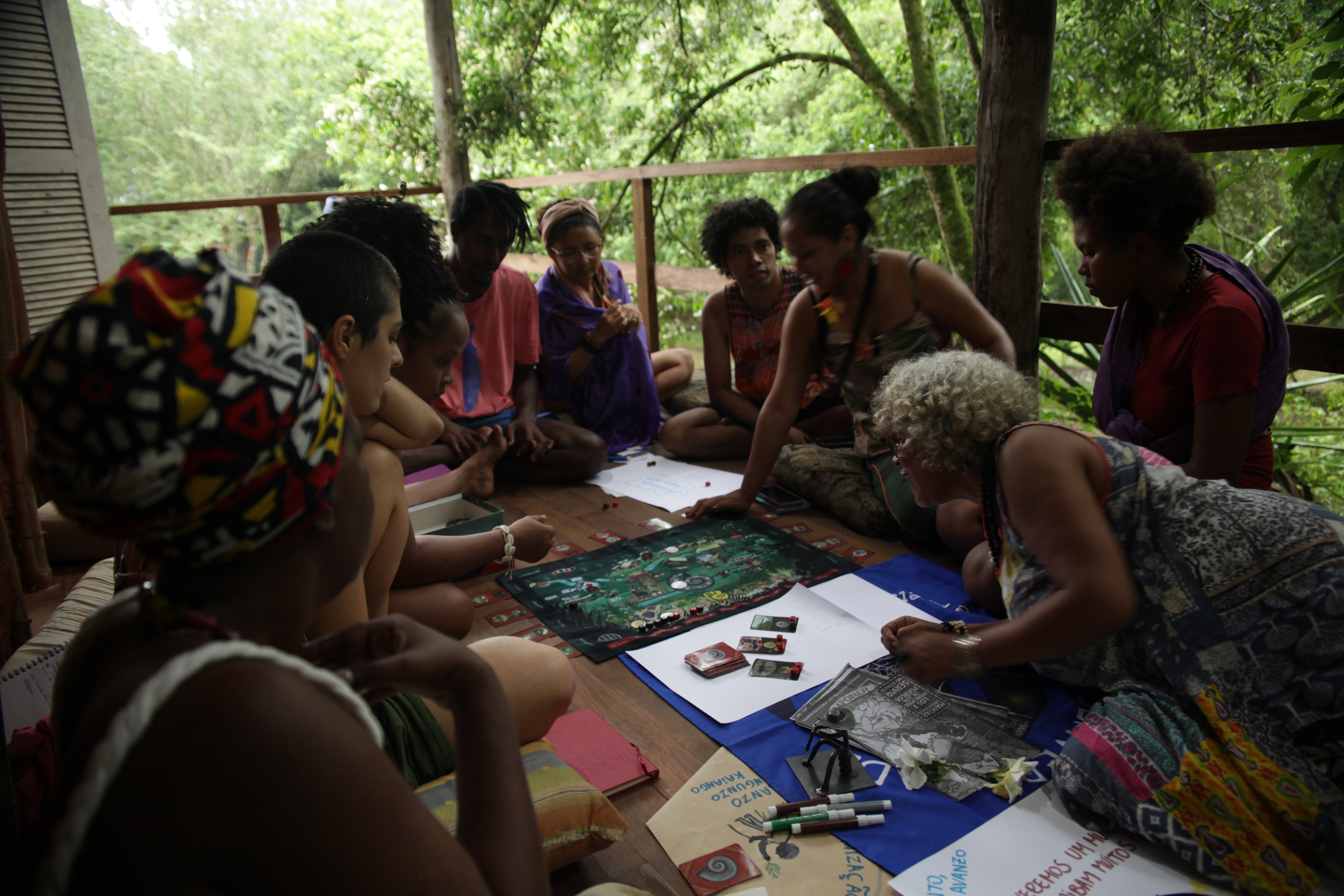 Folaiyan conduziu a oficina-jogo sobre autonomia comunitária, subsidiada pelo jogo de tabuleiro Autonomia Zapatista, na qual propôs refletir de forma lúdica sobre as formas de ocupação de espaços tradicionais, estruturação de identidades e lutas sociais correlatas ao processo de articulação política e autonomia das comunidades tradicionais. O que é autonomia? Quais movimentos são prioritários para a garantia da autonomia?, foram as perguntas disparadoras das reflexões. Um exercício potente de muita alegria, risadas, chuva de ideias e sonhos para construção de jogos elaborados pelos próprios jovens e crianças dos territórios.