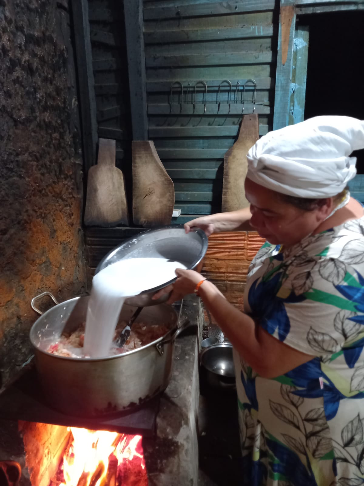 A noite seguinte foi a vez de entrarmos no Samba de Roda e culinária baiana do Território de Dandá/BA. Jamires, Mikaele e Télé com saias rodadas e coloridas conduziram a noite cultural compartilhando todo o gingado e a força ancestral do samba de roda de sua comunidade, bem como sua importância para a transmissão e difusão da cultura local. Como não poderia ser diferente, essa noite também teve uma deliciosa moqueca de ovo e cuscuz de tapioca baiano: “E haverá espetáculo mais lindo do que ter o que comer” já nos dizia Carolina Maria de Jesus. Na Multiversidade dos Povos da Terra de Mãe Preta, comer junto é ato poético, político e revolucionário.